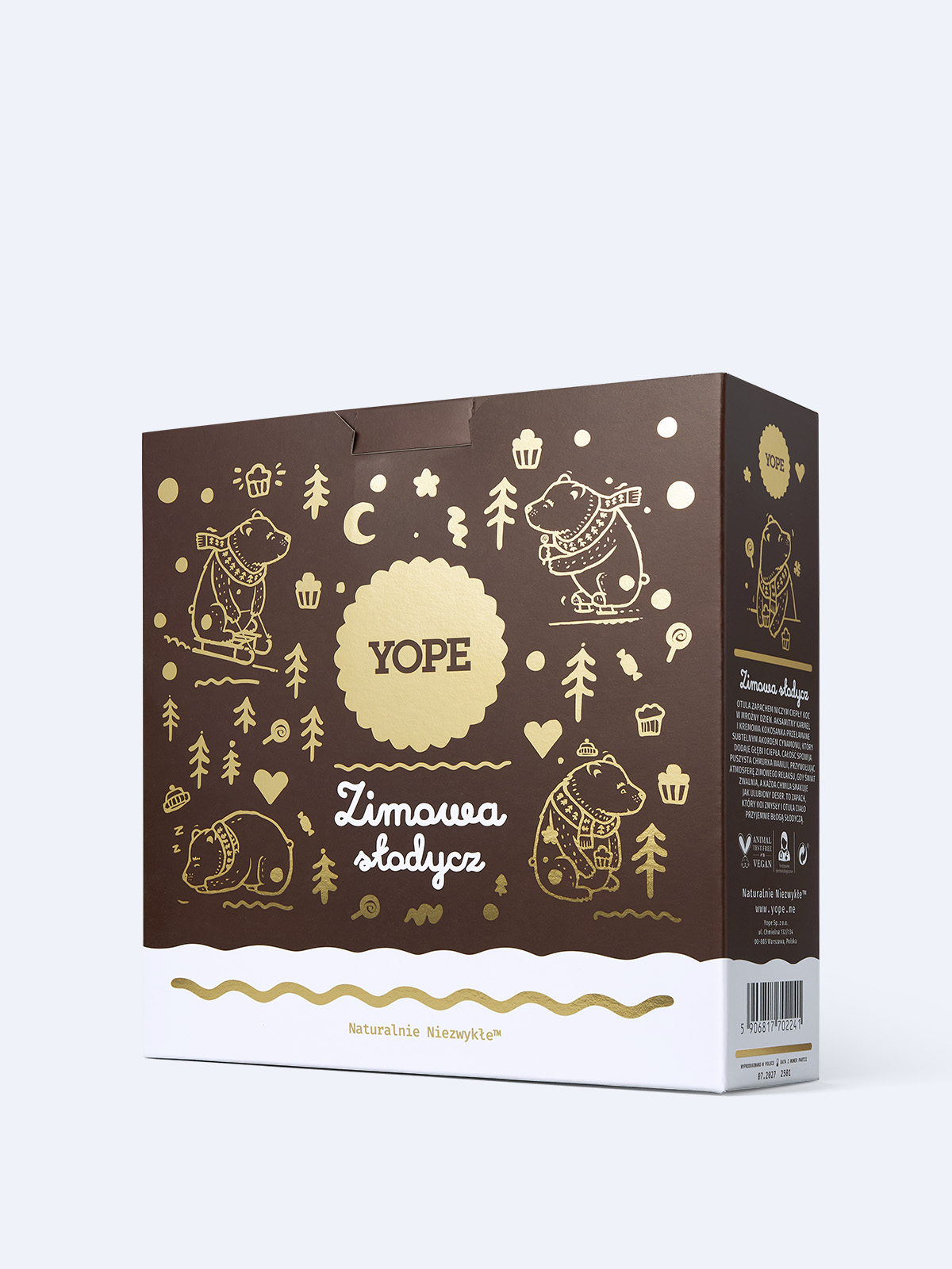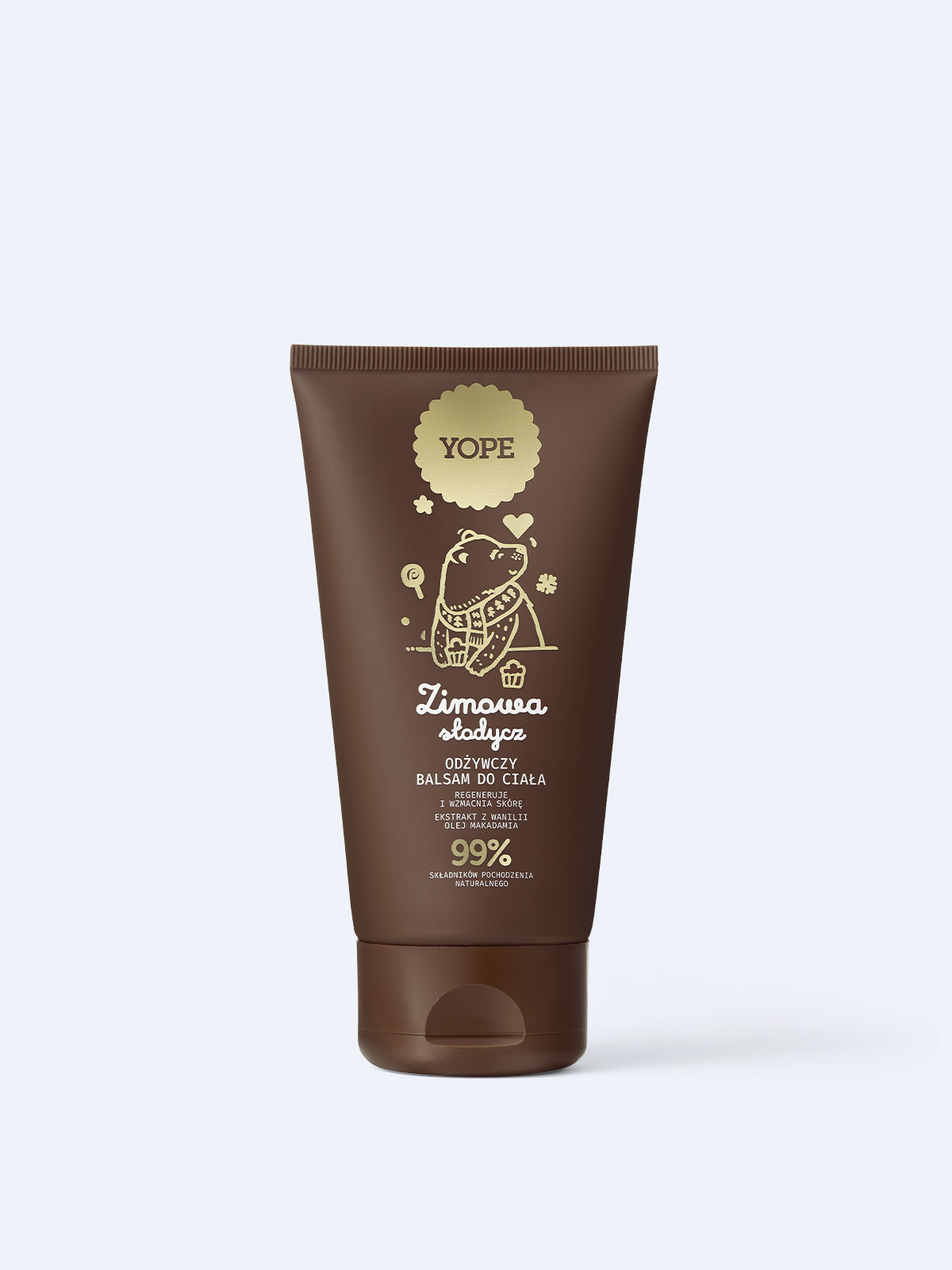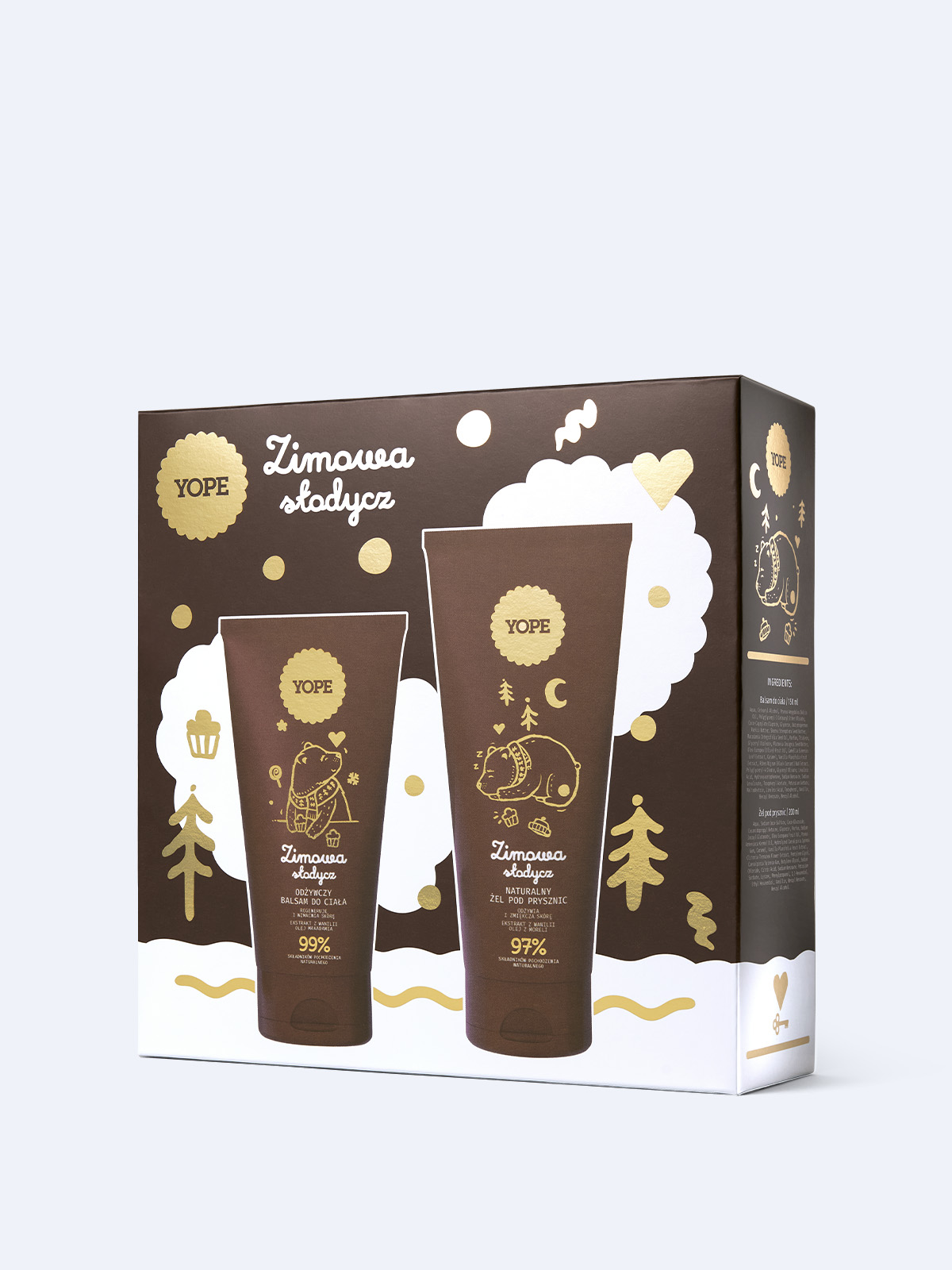 Odkryj zimową beztroskę zamkniętą w duecie pielęgnacyjnym od YOPE. Limitowany zestaw Zimowa słodycz łączy odżywczy balsam do ciała i nawilżający żel pod prysznic – dwa kosmetyki, które pielęgnują skórę i rozpieszczają zmysły. Aksamitny karmel, kremowa kokosanka, subtelny cynamon i waniliowa chmurka otulą Cię zapachem, który sprawi, że zima stanie się miękka, ciepła i pachnąca.