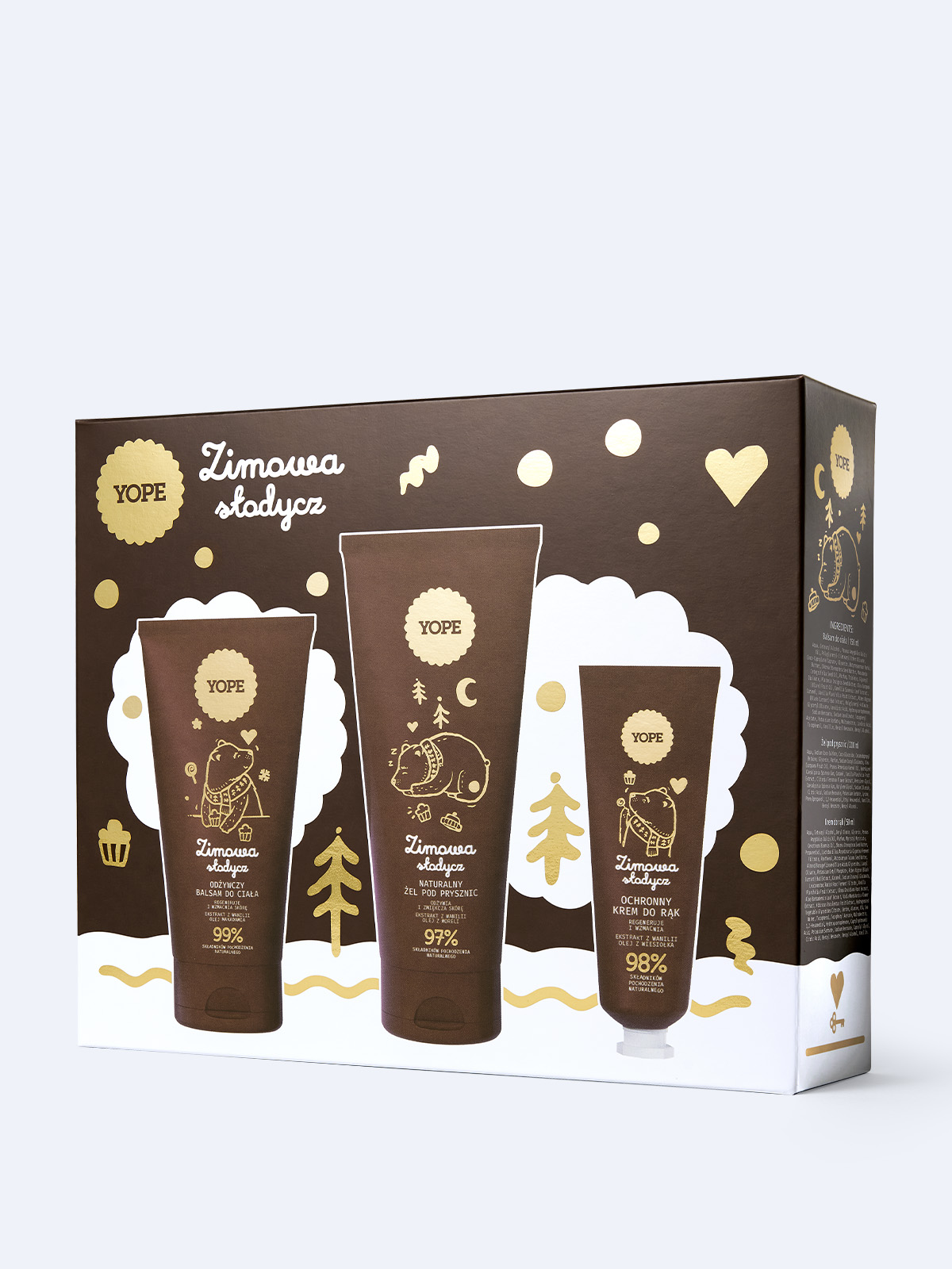 Zanurz się w aromatycznej zimowej beztrosce z zestawem Zimowa słodycz od YOPE. Limitowana edycja łączy żel pod prysznic, odżywczy balsam do ciała i ochronny krem do rąk – trio, które pielęgnuje skórę, otula ją słodkim zapachem karmelu, kokosanki, cynamonu i wanilii, i wprowadza w błogi, zimowy nastrój.
